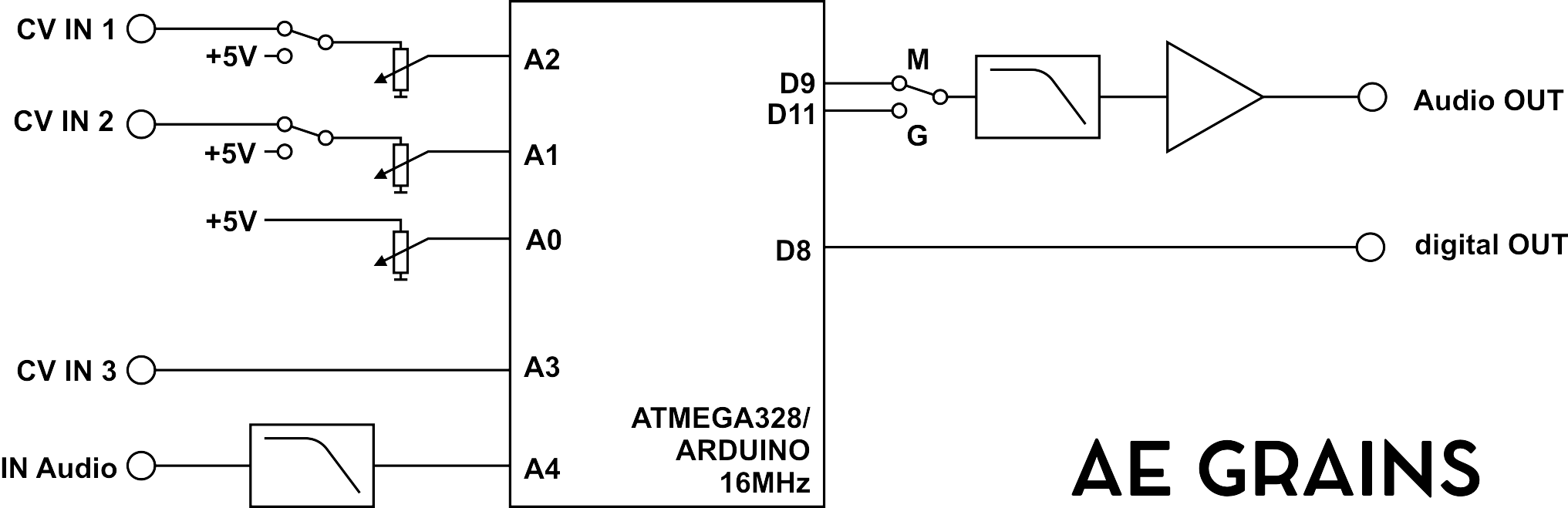 - Switch M/G - Selects the internal audio-out pin, use 'M' for 'Mozzi mode' or 'G' for 'Ginkosynthese / original Grains mode' - Depending on the Firmware used, GRAINS may use the one or the other output option! (If you should experience silence at the output, when not expecting it, please make sure to try out the other option as well.)