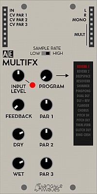 This 1/3 height micro module provides a bit crushing effect to the incoming audio signal. The signal will be sampled into smaller segments and those segments can then be reduced and shuffled to achieve a degradation of the input signal.