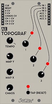 This 1/3 height micro module routes an incoming gate signal to one of 3 outputs based on chance via a probability function. This is very similar to the Bernoulli Gate from Mutable Instruments.